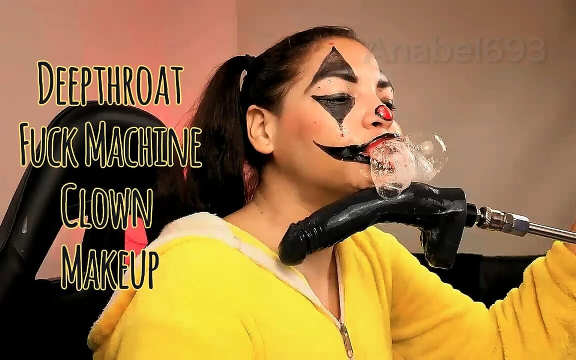Cute brunette Latina wears horny clown makeup and fucks her throat with fuck machine, her mouth gets very wet and creates huge saliva bubbles and sloppy