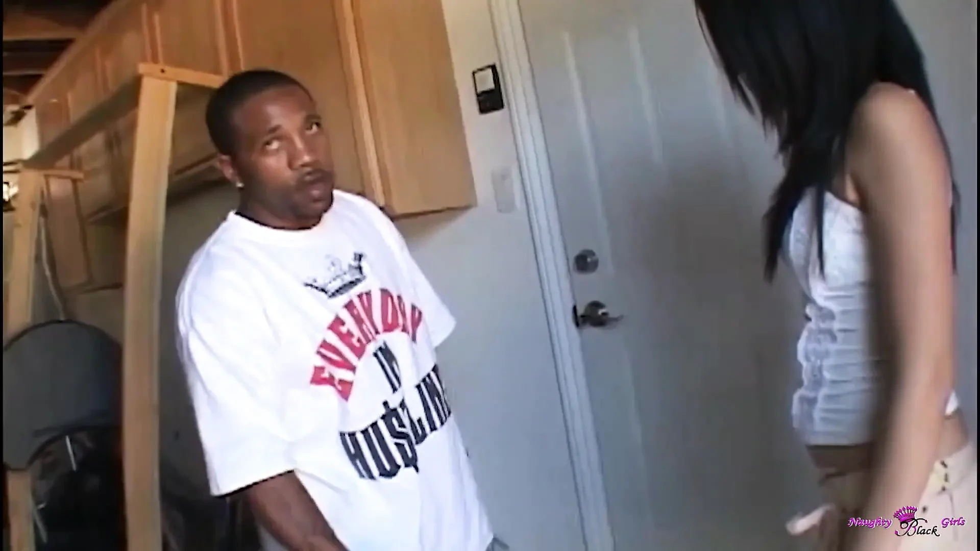 An alluring individual with modest breasts is selected for vigorous intercourse by a robust partner.