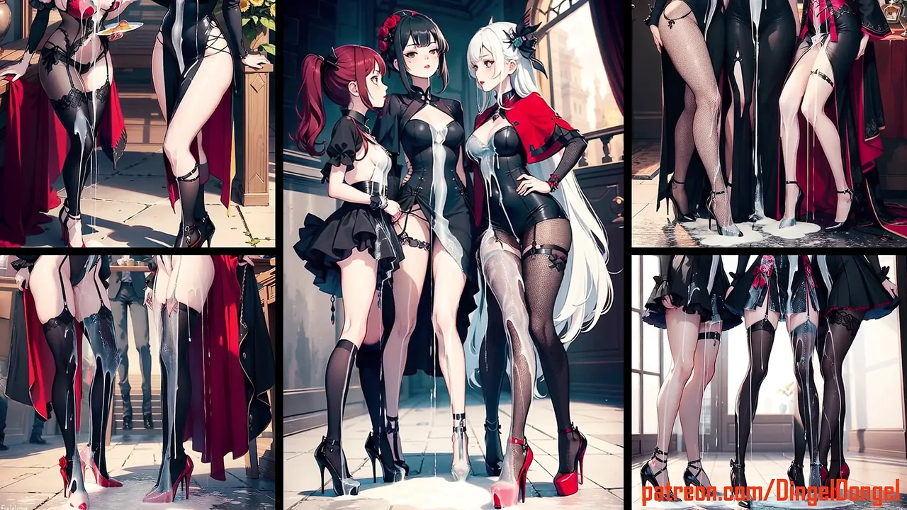 Anime girls in sexy clothes and colorful surroundings are sprayed with ejaculate from all sides.